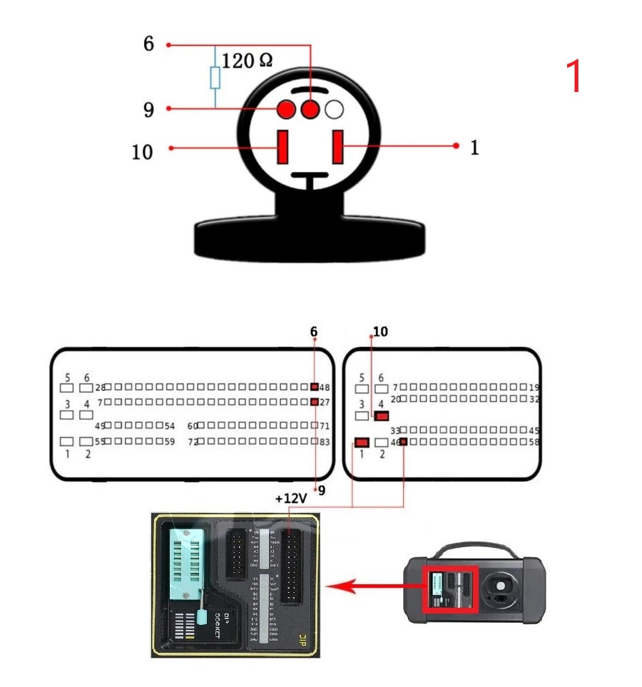 Рис. 1 - клонирование модуля ECU в режиме BENCH без использования адаптера MCU3 kit. Требует подключения резистора 120 Ом и источник питания +12V, который подключают к блоку IMMO.